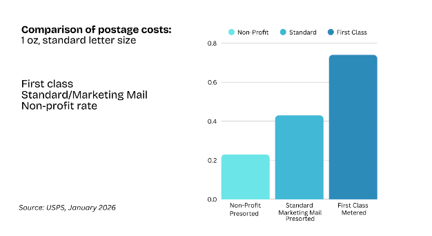 Nonprofit USPS discounted postage rates can be roughly 40–50% lower than commercial USPS Marketing Mail rates
